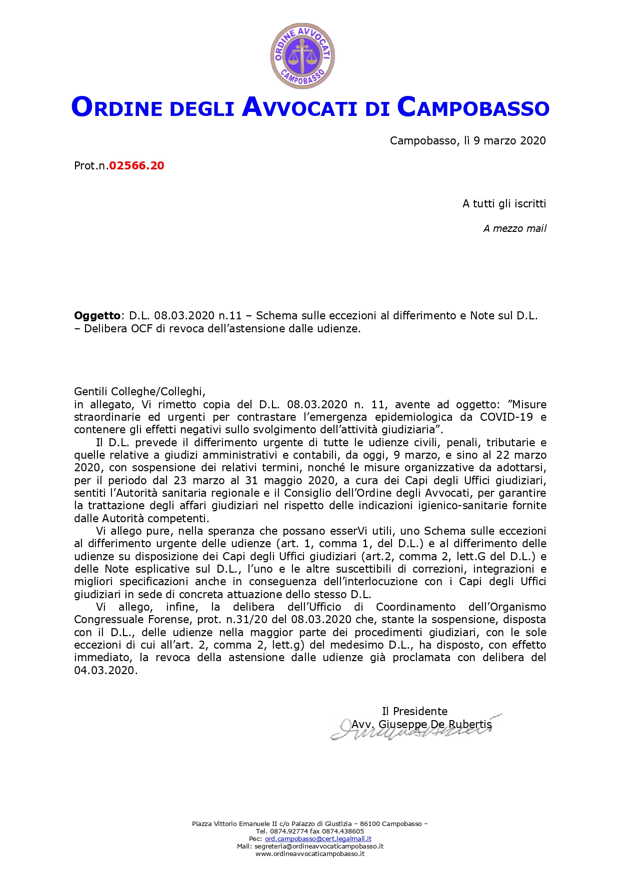 D.L. 08.03.2020 N.11 – SCHEMA SULLE ECCEZIONI AL DIFFERIMENTO E NOTE SUL D.L. – DELIBERA OCF DI REVOCA DELL’ASTENSIONE DALLE UDIENZE.