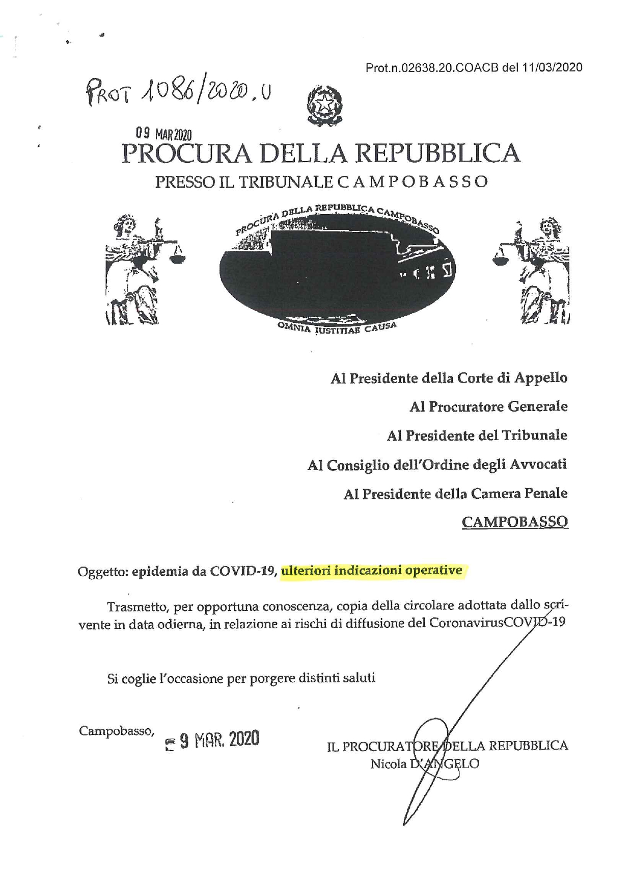 PROCURA DELLA REPUBBLICA – EMERGENZA COVID-19 – ULTERIORI INDICAZIONI OPERATIVE – UFFICI PROCURA