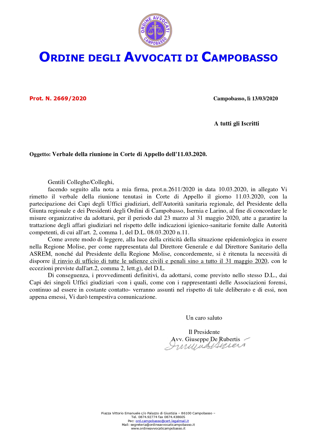 COA CB – LETTERA DEL PRESIDENTE – VERBALE DELLA RIUNIONE IN CORTE DI APPELLO DELL’ 11/03/2020