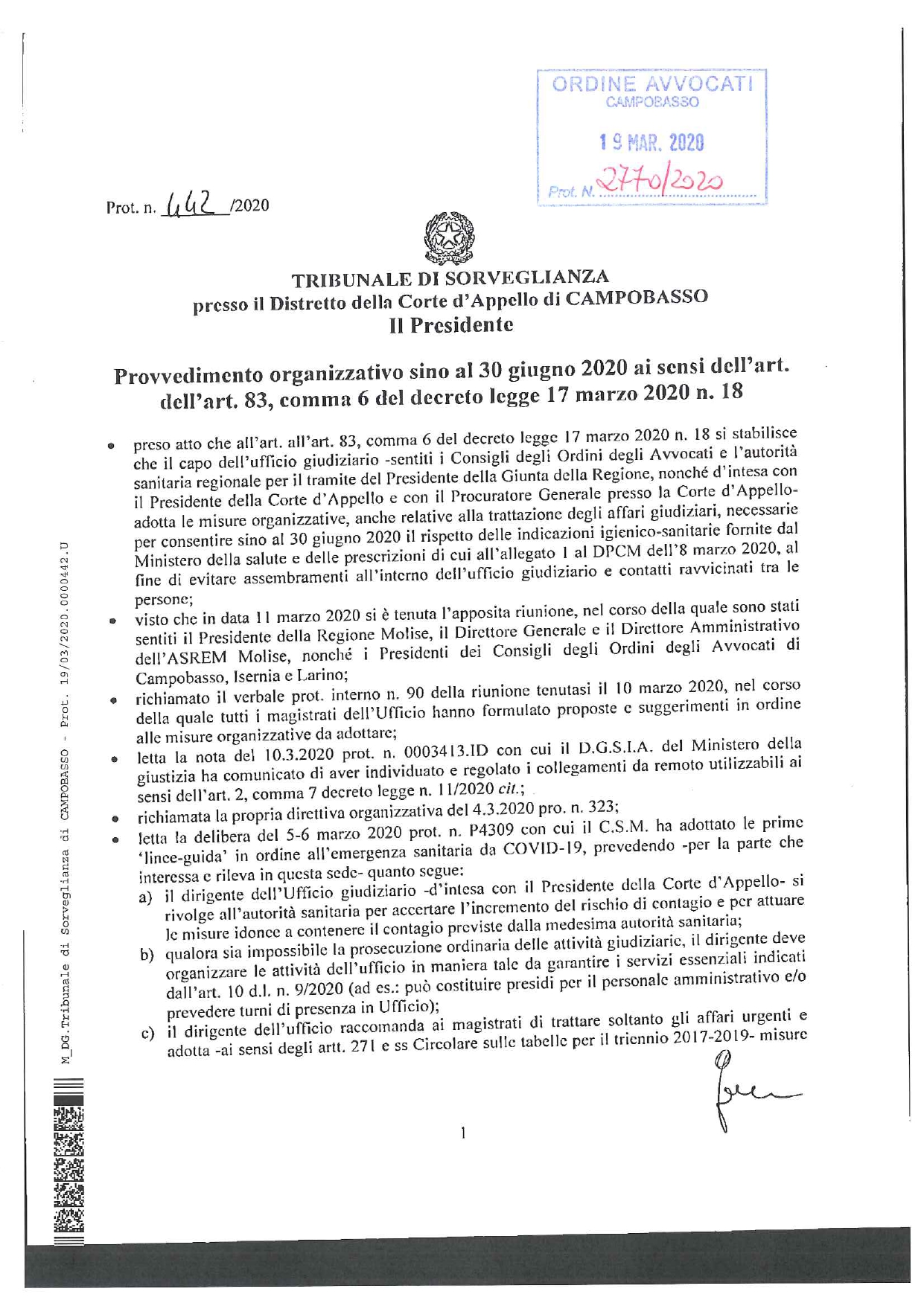 TRIBUNALE DI SORVEGLIANZA – PROVVEDIMENTO ORGANIZZATIVO SINO AL 30 GIUGNO 2020