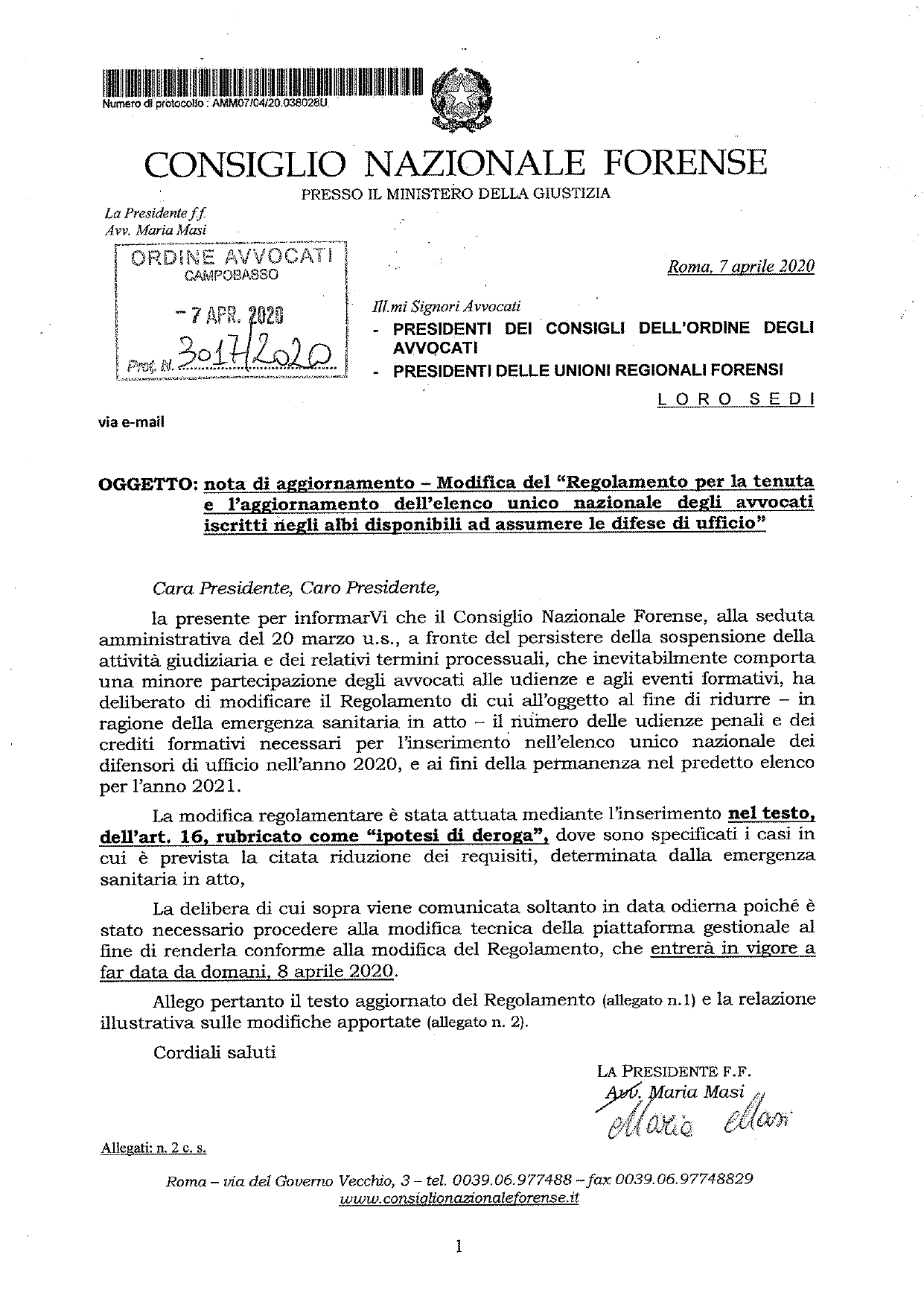 CNF – MODIFICA REGOLAMENTO – TENUTA E AGGIORNAMENTO DELL’ELENCO DEI DIFENSORI DI UFFICIO