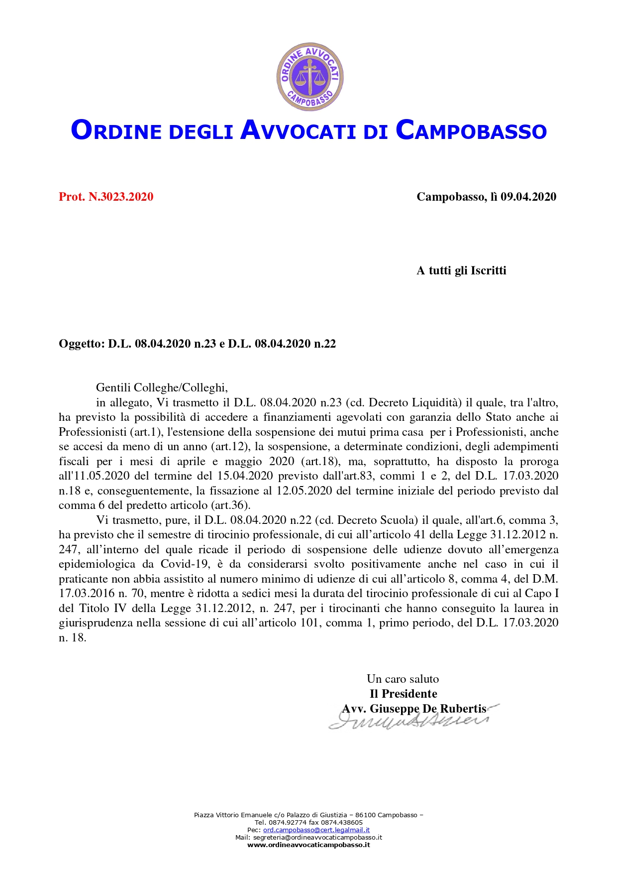 DL 08.04.2020 n. 23 e DL 08.04.2020 n. 22 – nota del Presidente