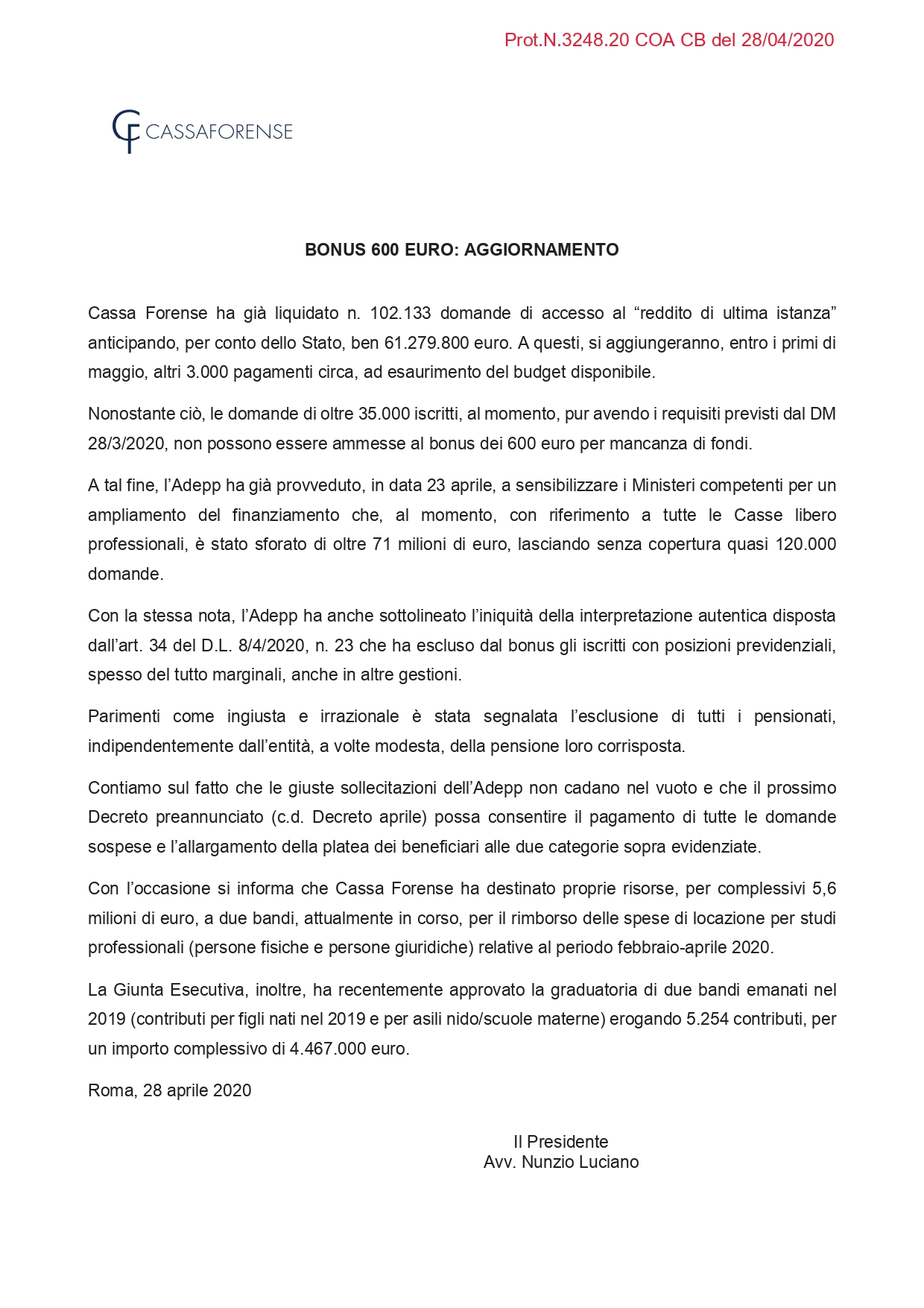 CASSA FORENSE – AGGIORNAMENTO BONUS 600€ – COMUNICATO 28.04.2020