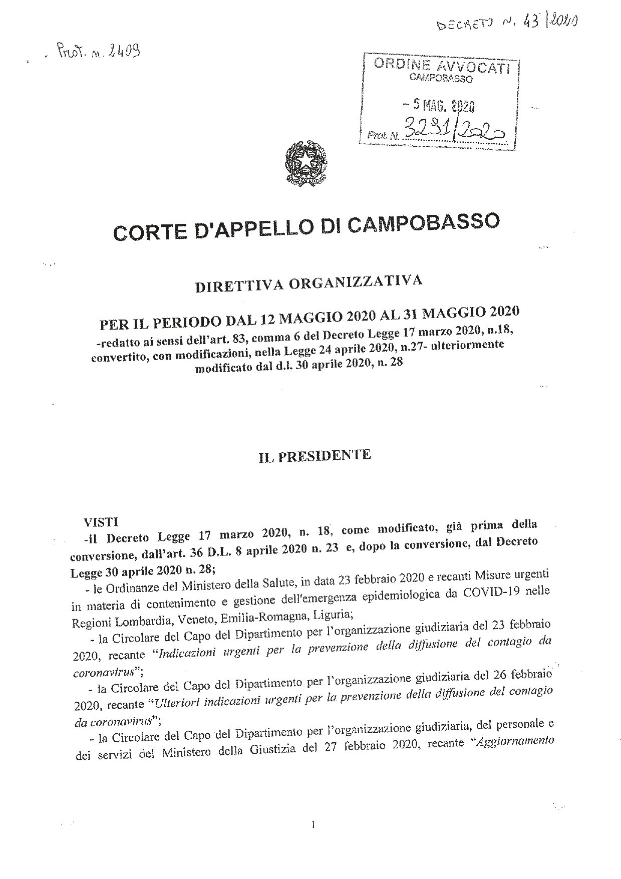 Corte di Appello – Direttiva Organizzativa udienze e accesso agli uffici – periodo 12-05 – 31.05.2020