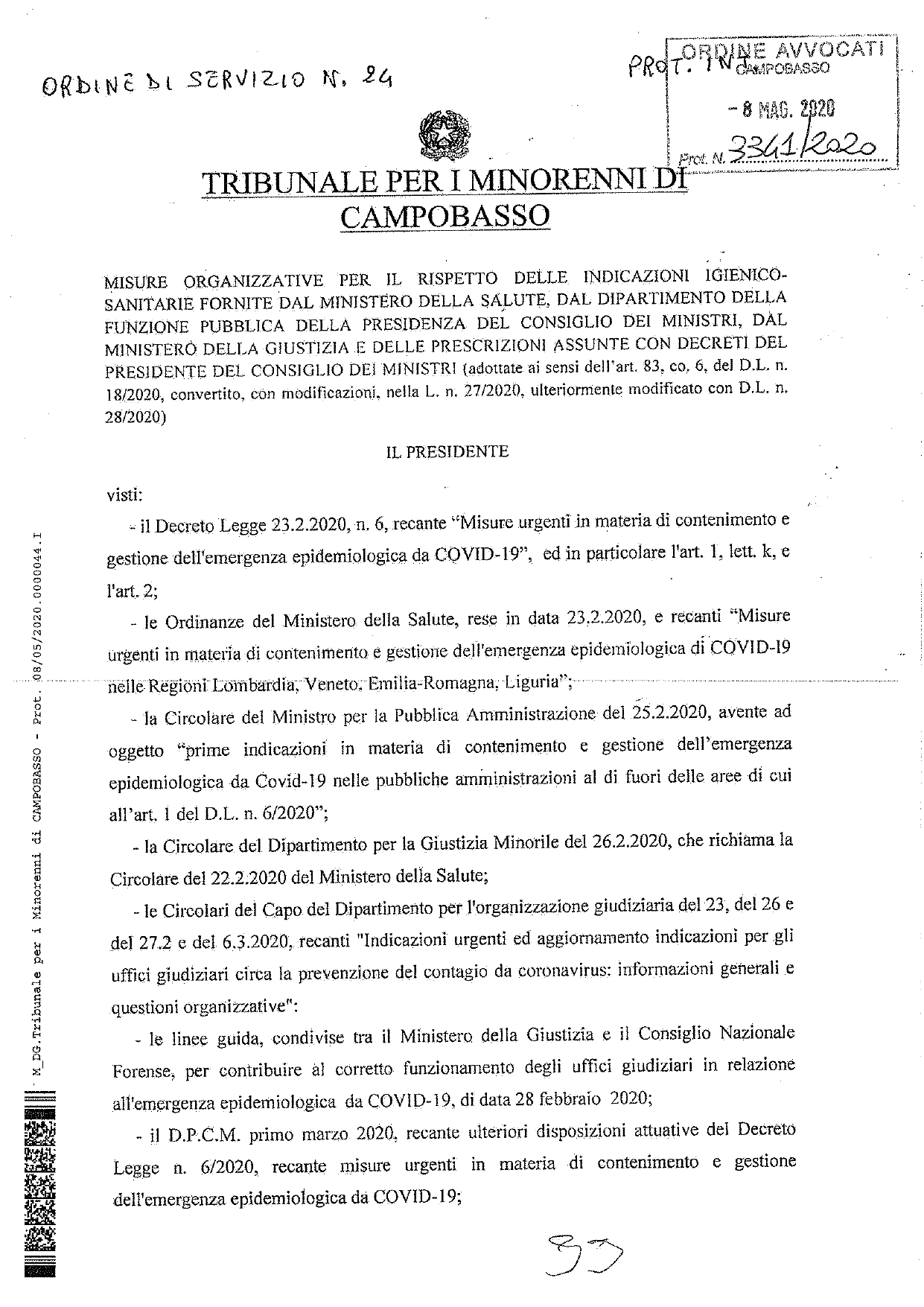 Tribunale per i Minorenni Campobasso – Ordine di servizio n 24 – misure organizzative COVID-19