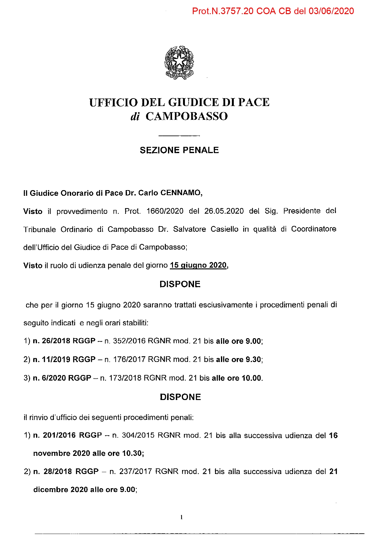 GIUDICE DI PACE – DR. CENNAMO – Comunicazione udienza penale del 15-6-2020