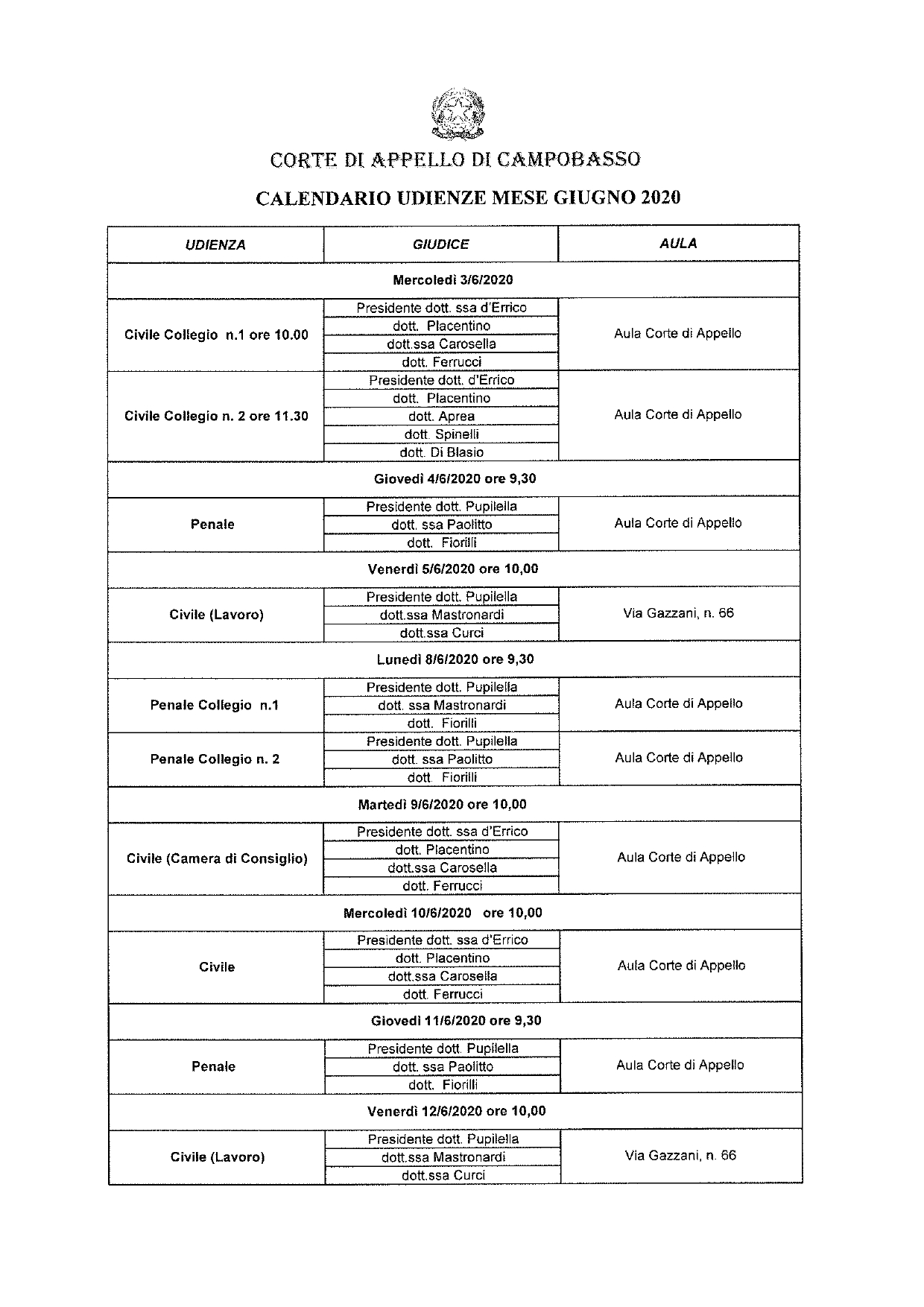 CORTE DI APPELLO – CALENDARIO UDIENZE GIUGNO 2020