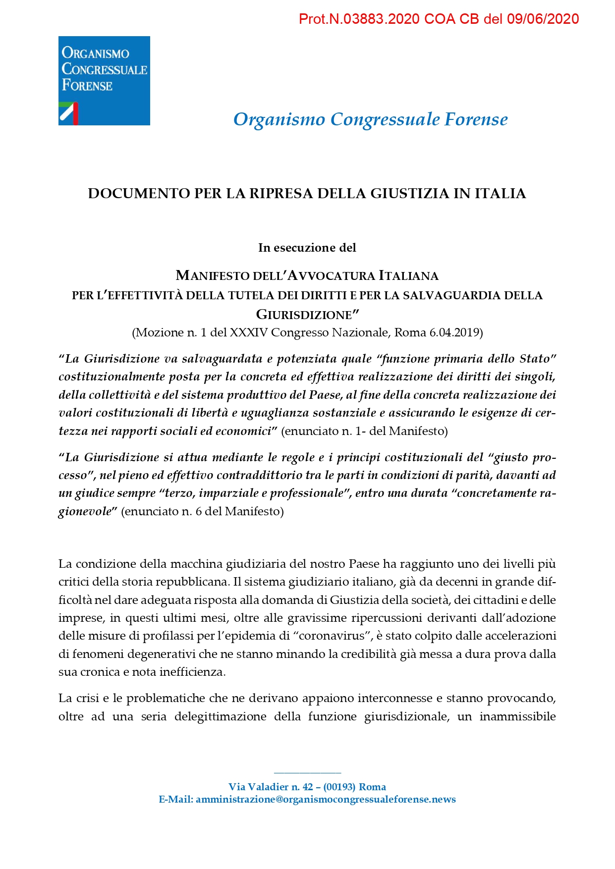 O.C.F. – DOCUMENTO PER L’EMERGENZA DELLA GIUSTIZIA