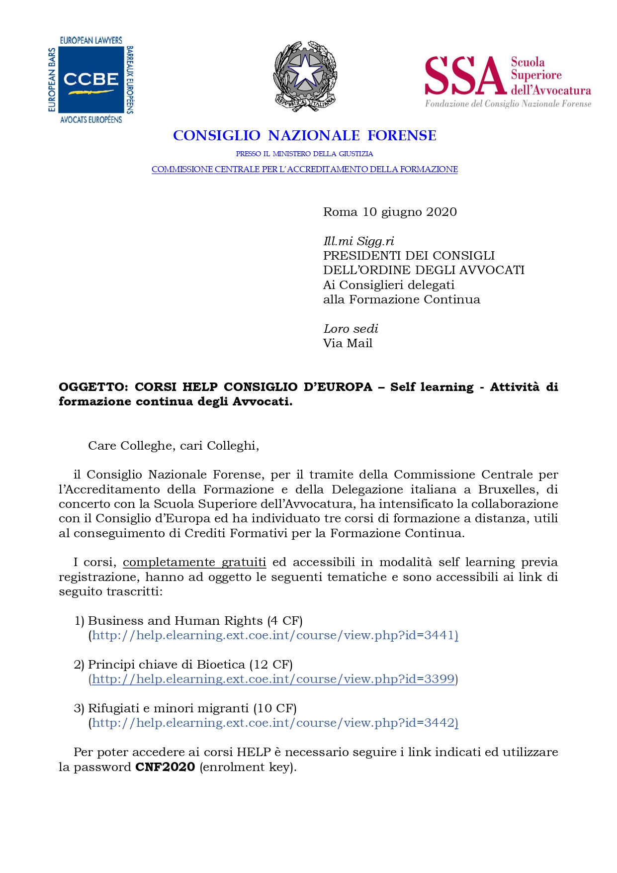 C.N.F. – CORSI HELP CONSIGLIO D’EUROPA – Self learning – Attività di formazione continua degli Avvocati.