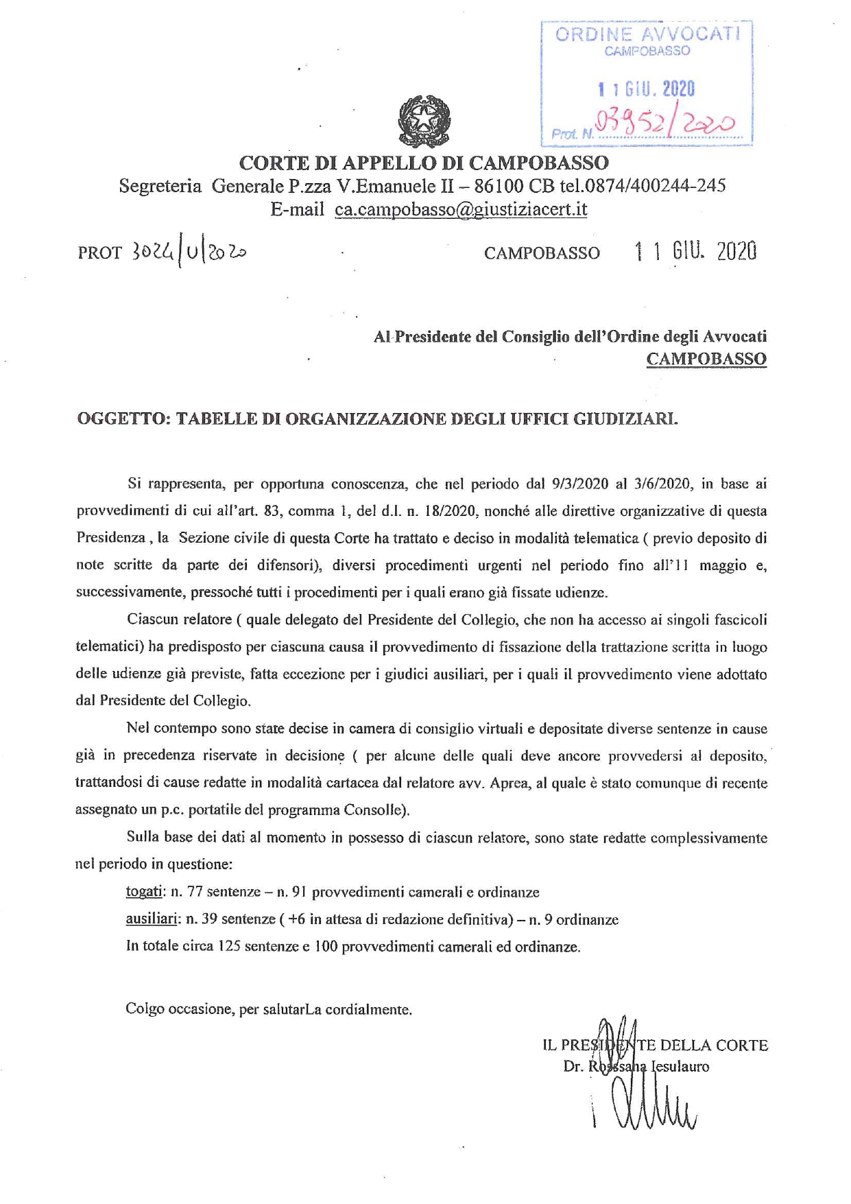 CORTE DI APPELLO – TABELLE DI ORGANIZZAZIONE DEGLI UFFICI GIUDIZIARI