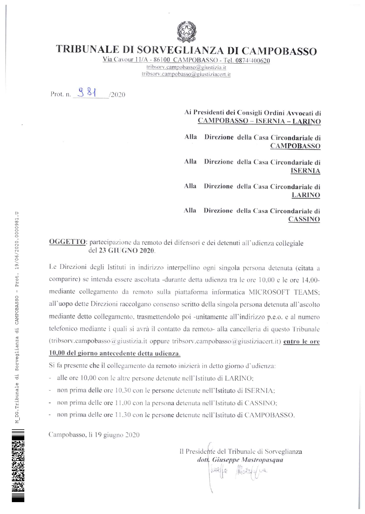TRIBUNALE DI SORVEGLIANZA – PARTECIPAZIONE DA REMOTO DEI DIFENSORI E DEI DETENUTI ALL’UDIENZA COLLEGIALE DEL 23.06.2020