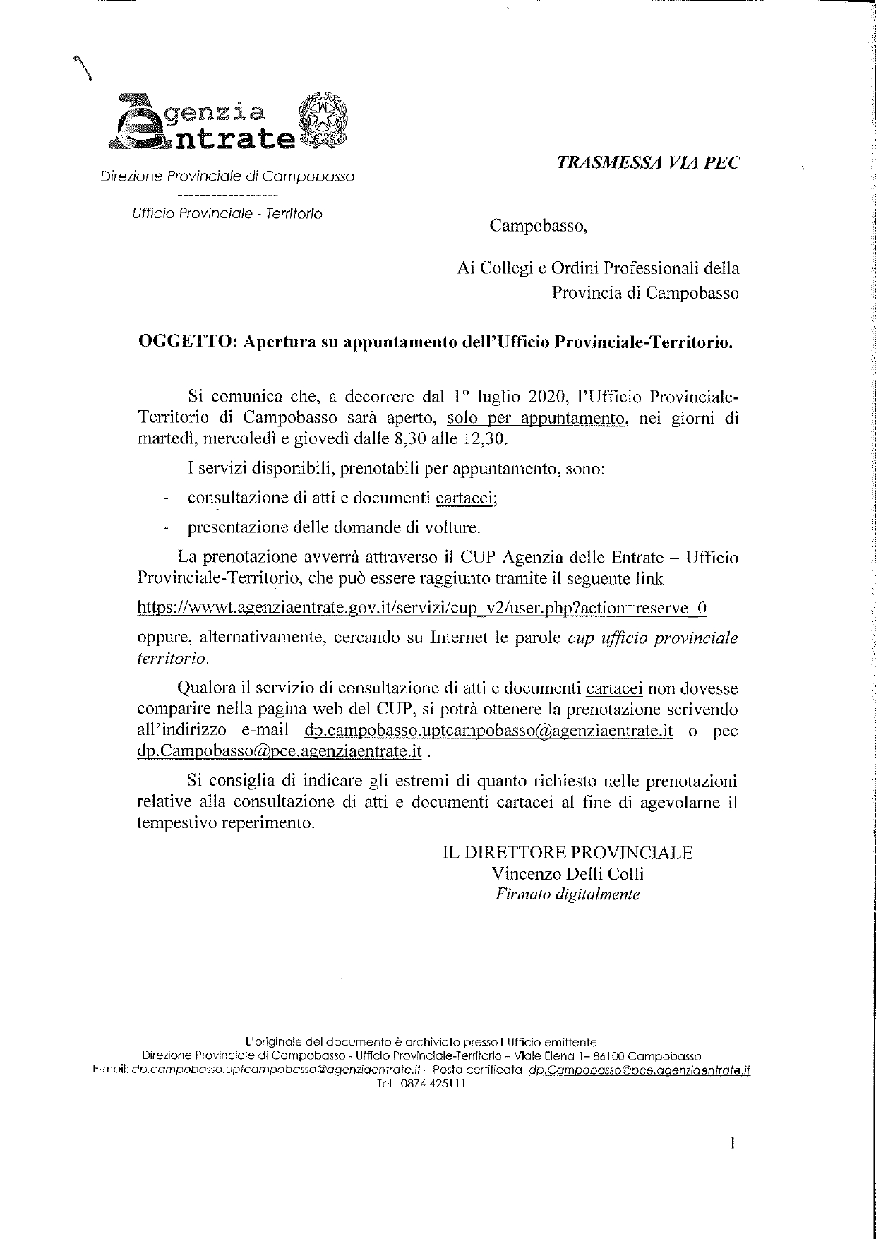 AGENZIA DELLE ENTRATE – APERTURA SU APPUNTAMENTO DELL’UFFICIO PROVINCIALE – TERRITORIO DAL 1 LUGLIO 2020