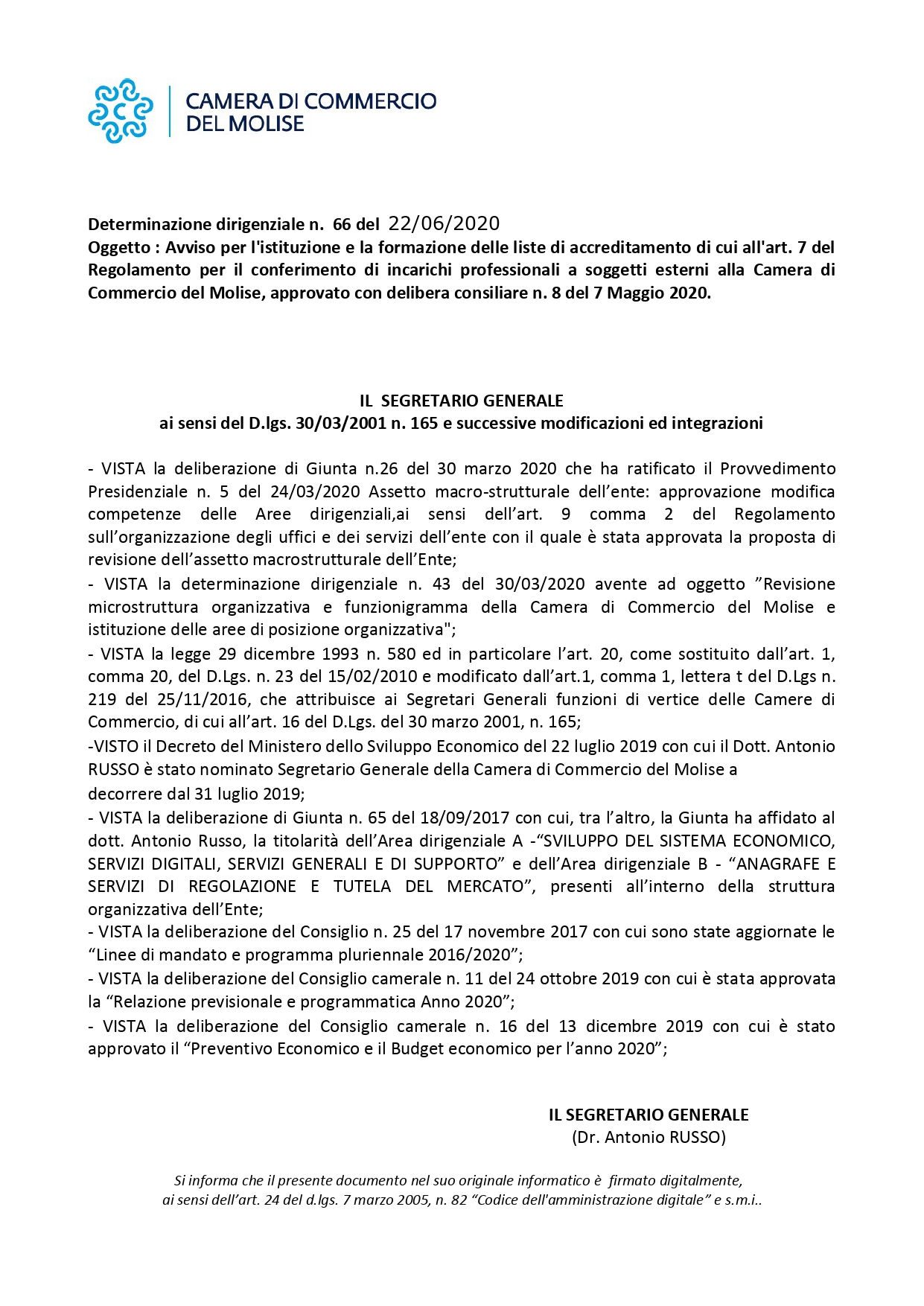 CAMERA DI COMMERCIO DEL MOLISE- DETERMINAZIONE DIRIGENZIALE N. 66 DEL 22/06/2020