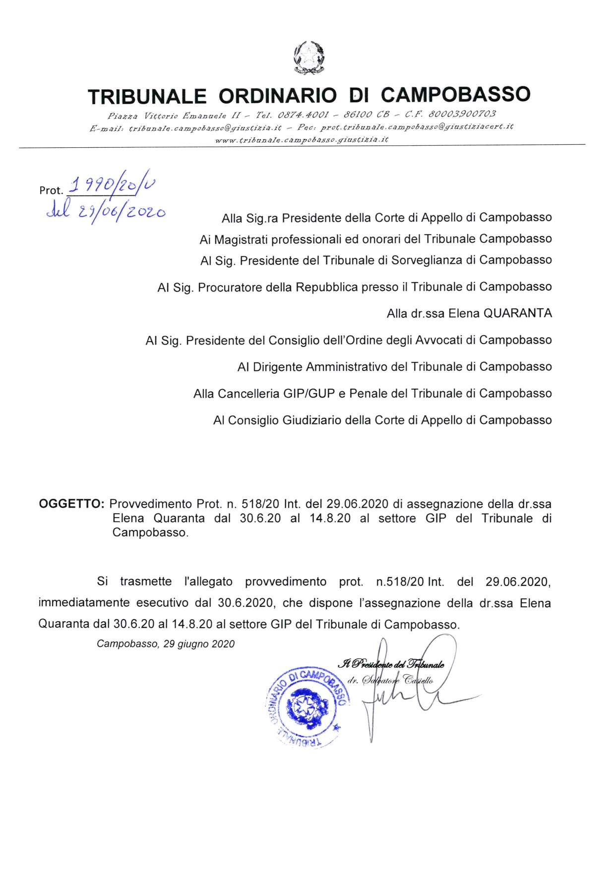 TRIBUNALE DI CAMPOBASSO – Provv. Prot.518 20 Int. – Assegnazione Dr.ssa Quaranta al settore GIP
