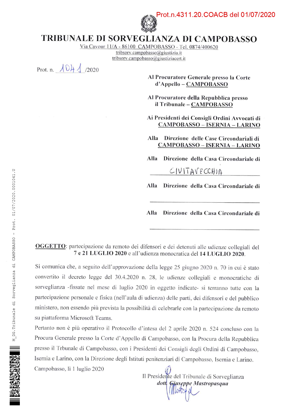 TRIBUNALE DI SORVEGLIANZA – PARTECIPAZIONE DA REMOTO DI DIFENSORI E DETENUTI – UDIENZE 7, 14, 21 LUGLIO 2020