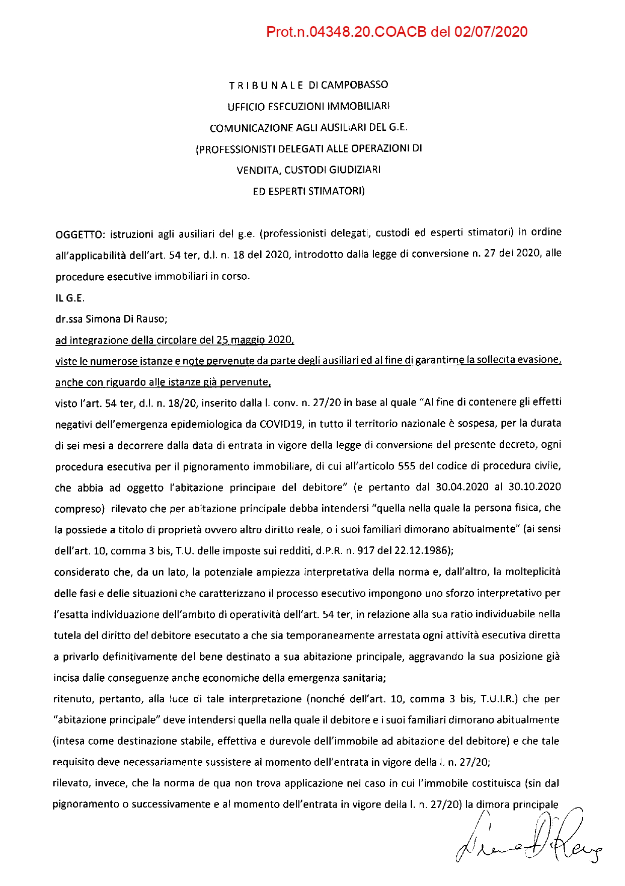 TRIBUNALE DI CAMPOBASSO – DR.SSA DI RAUSO – ISTRUZIONI AGLI AUSILIARI DEL G.E 2.7.2020