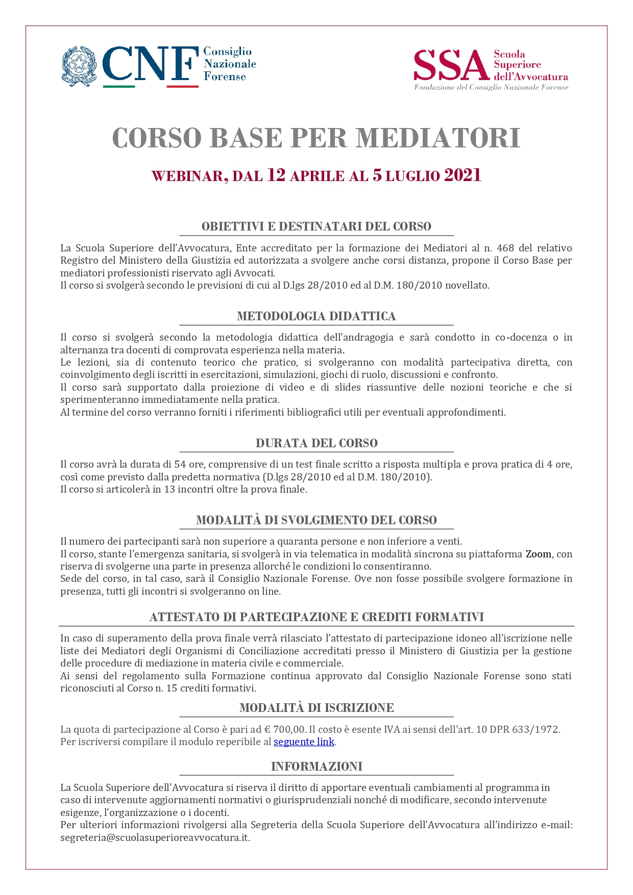 SCUOLA SUPERIORE AVVOCATURA – OFFERTA FORMATIVA IN MATERIA DI MEDIAZIONE