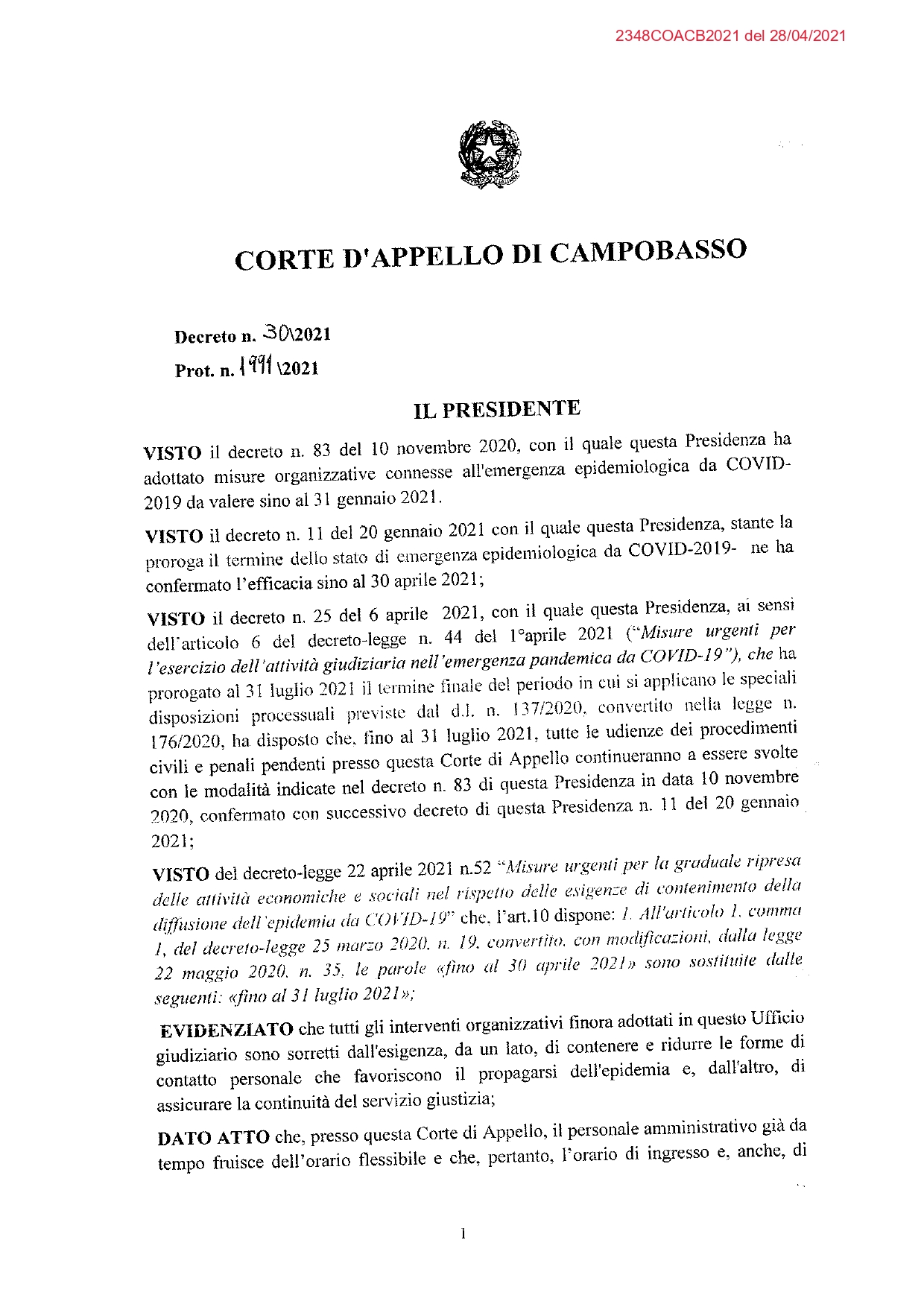 CORTE DI APPELLO – DECRETO N.30/2021 – MISURE ORGANIZZATIVE EMERGENZA COVID-19