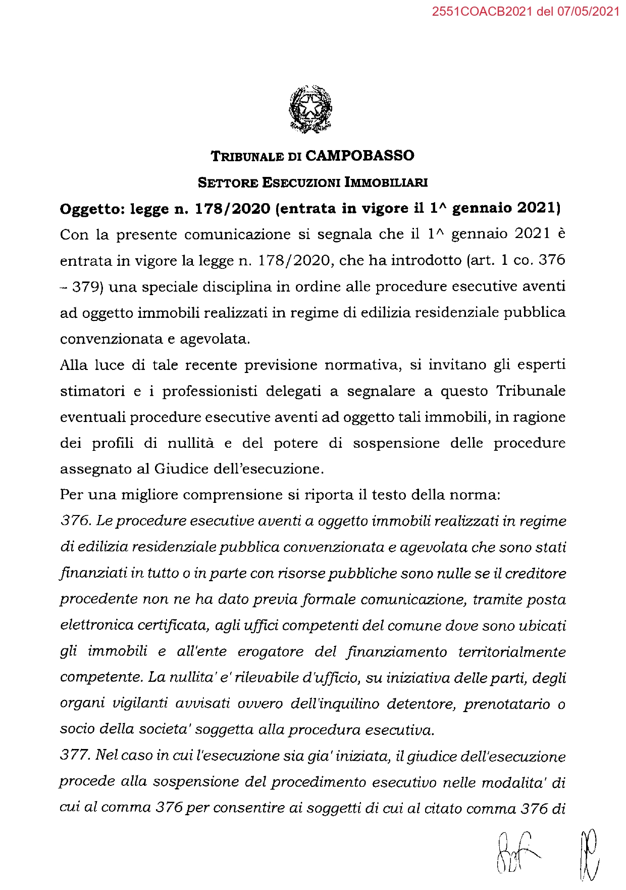 TRIBUNALE DI CAMPOBASSO – SETTORE ESECUZIONI IMMOBILIARI – LEGGE N.178/2020 (entrata in vigore il 1 gennaio 2021)