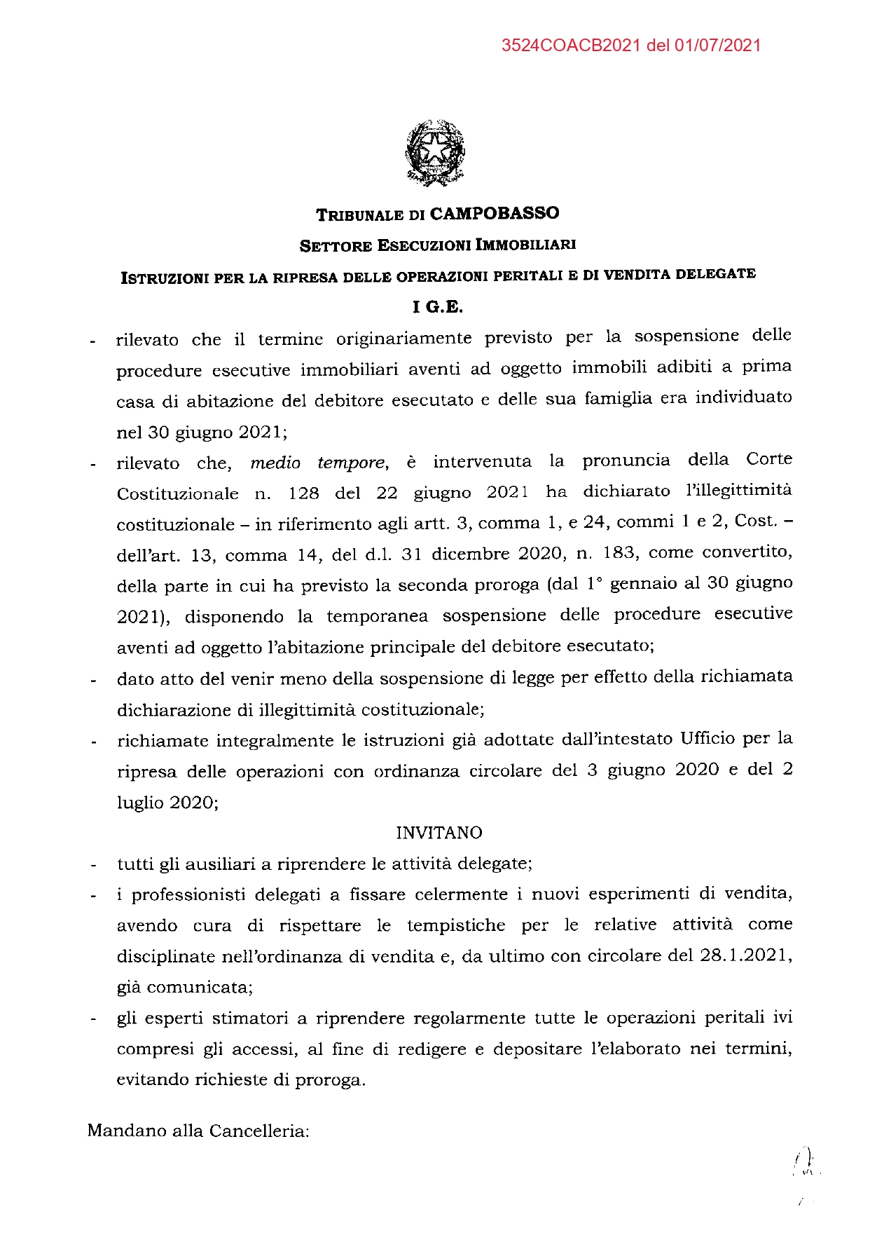 TRIBUNALE DI CAMPOBASSO – PROVV. G.E. – RIPRESA OPERAZIONI PERITALI E DI VENDITA DELEGATA
