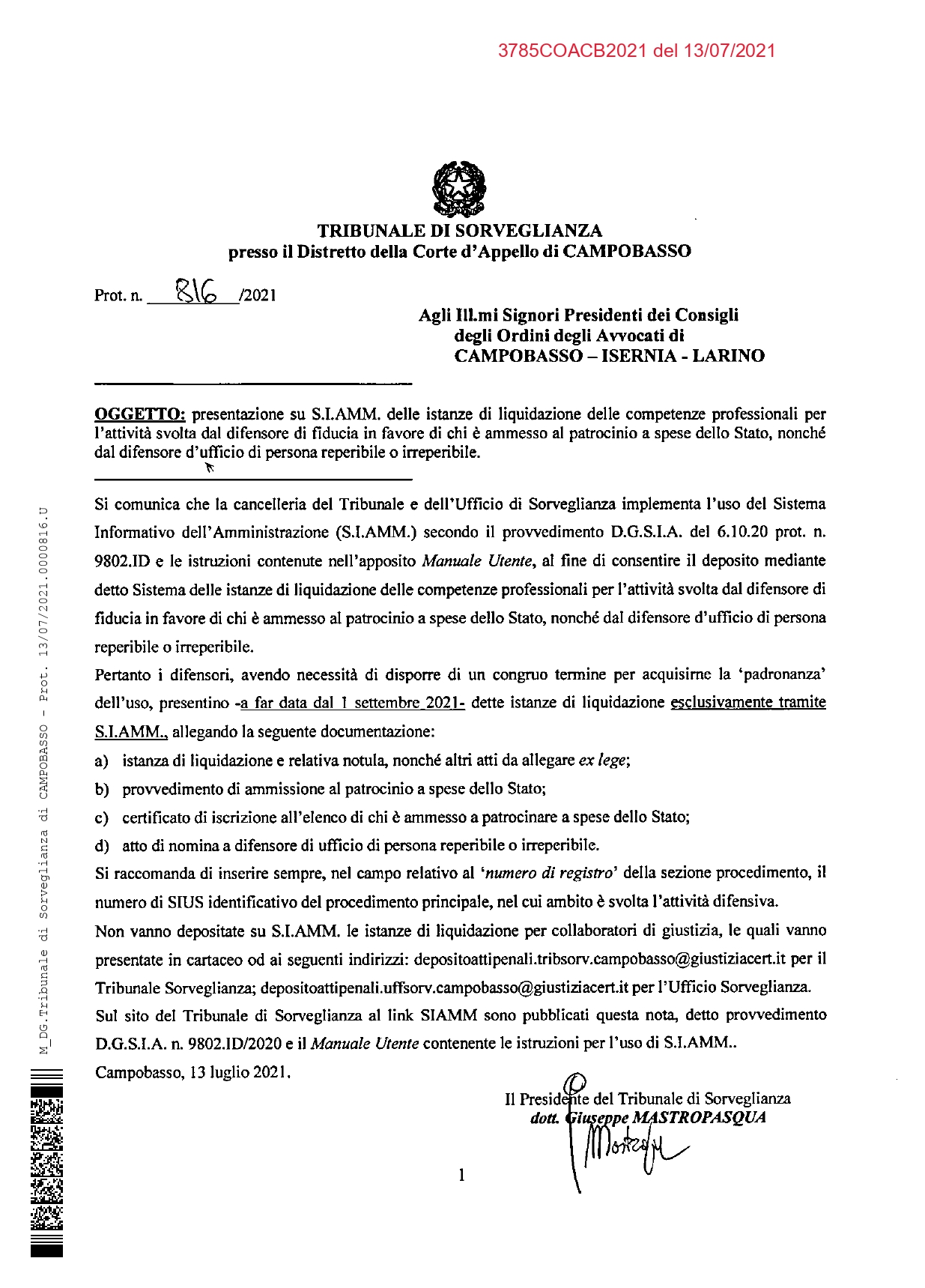 TRIBUNALE DI SORVEGLIANZA – PRESENTAZIONE ISTANZE LIQUIDAZIONE COMPENSI TRAMITE PIATTAFORMA S.I.AMM. – PROVV. 13 LUGLIO 2021