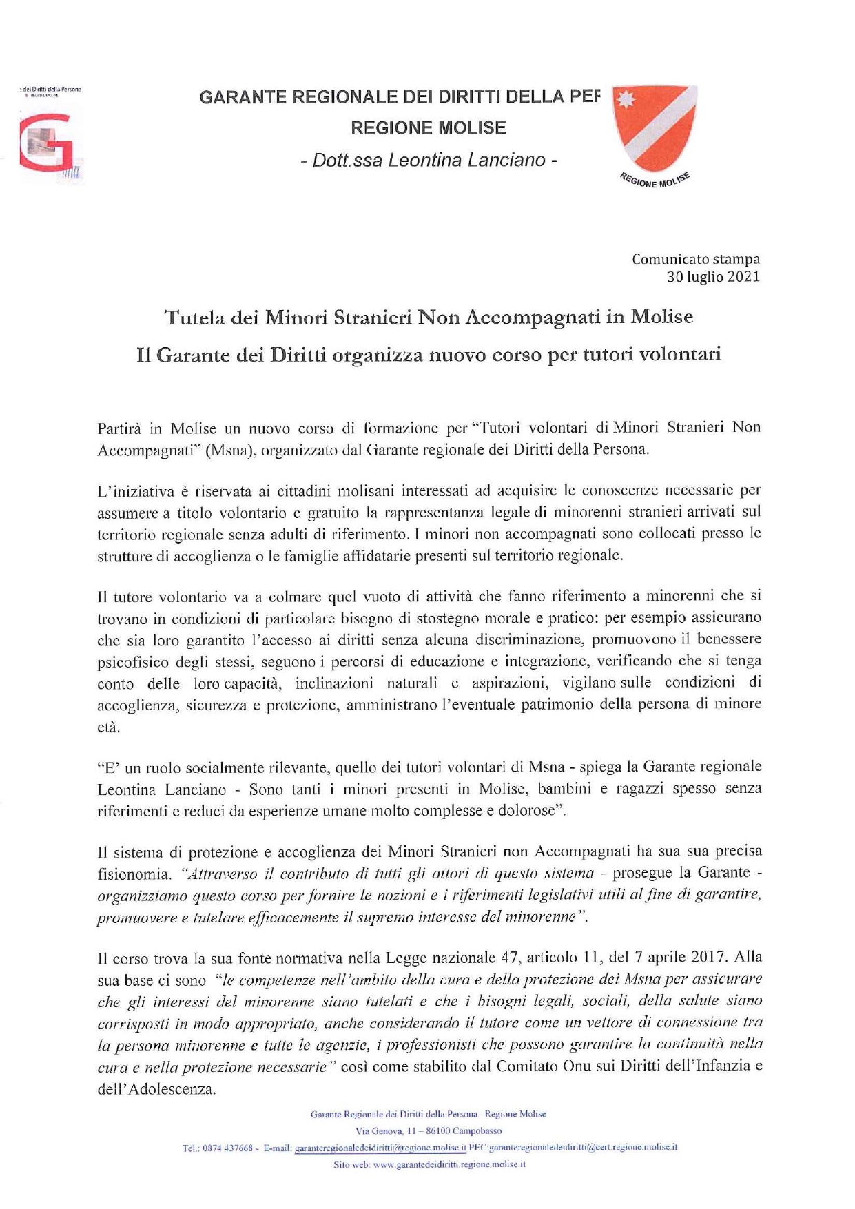 TUTELA DEI MINORI STRANIERI NON ACCOMPAGNATI IN MOLISE – IL GARANTE DEI DIRITTI ORGANIZZA NUOVO CORSO PER TUTORI VOLONTARI