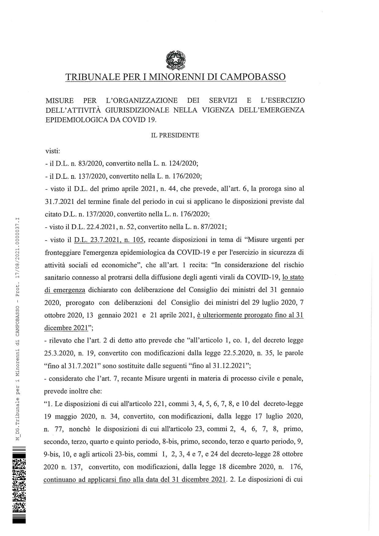 TRIBUNALE MINORENNI CB MISURE PER L'ORGANIZZAZIONE DEI SERVIZI E L'ESERCIZIO DELL'ATTIVITA' GIURISDIZIONALE NELLA VIGENZA DELL'EMERGENZA EPIDEMIOLOGICA DA COVID 19_page-0001