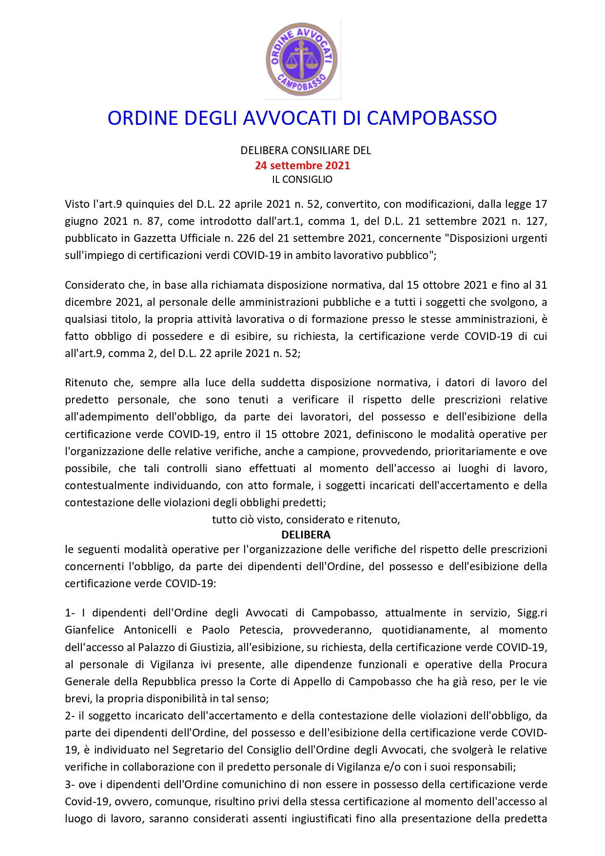 CERTIFICAZIONE VERDE COVID 19 – MODALITA’ OPERATIVE DI VERIFICA SUI DIPENDENTI DEL COA DI CAMPOBASSO