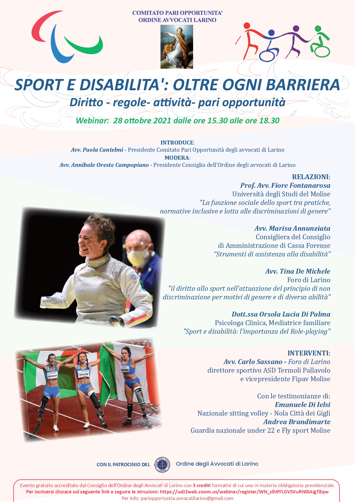 EVENTO C.P.O. LARINO 28 OTTOBRE 2021: SPORT E DISABILITA’ OLTRE OGNI BARRIERA – DIRITTO-REGOLE-ATTIVITA’-PARI OPPORTUNITA’