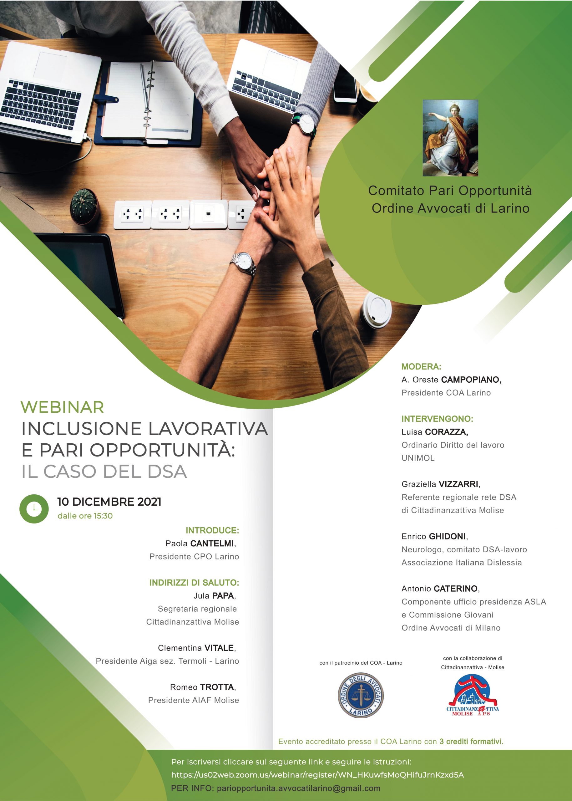 CPO LARINO – WEBINAR “INCLUSIONE LAVORATIVA E PARI OPPORTUNITA’ – IL CASO DEL DSA”