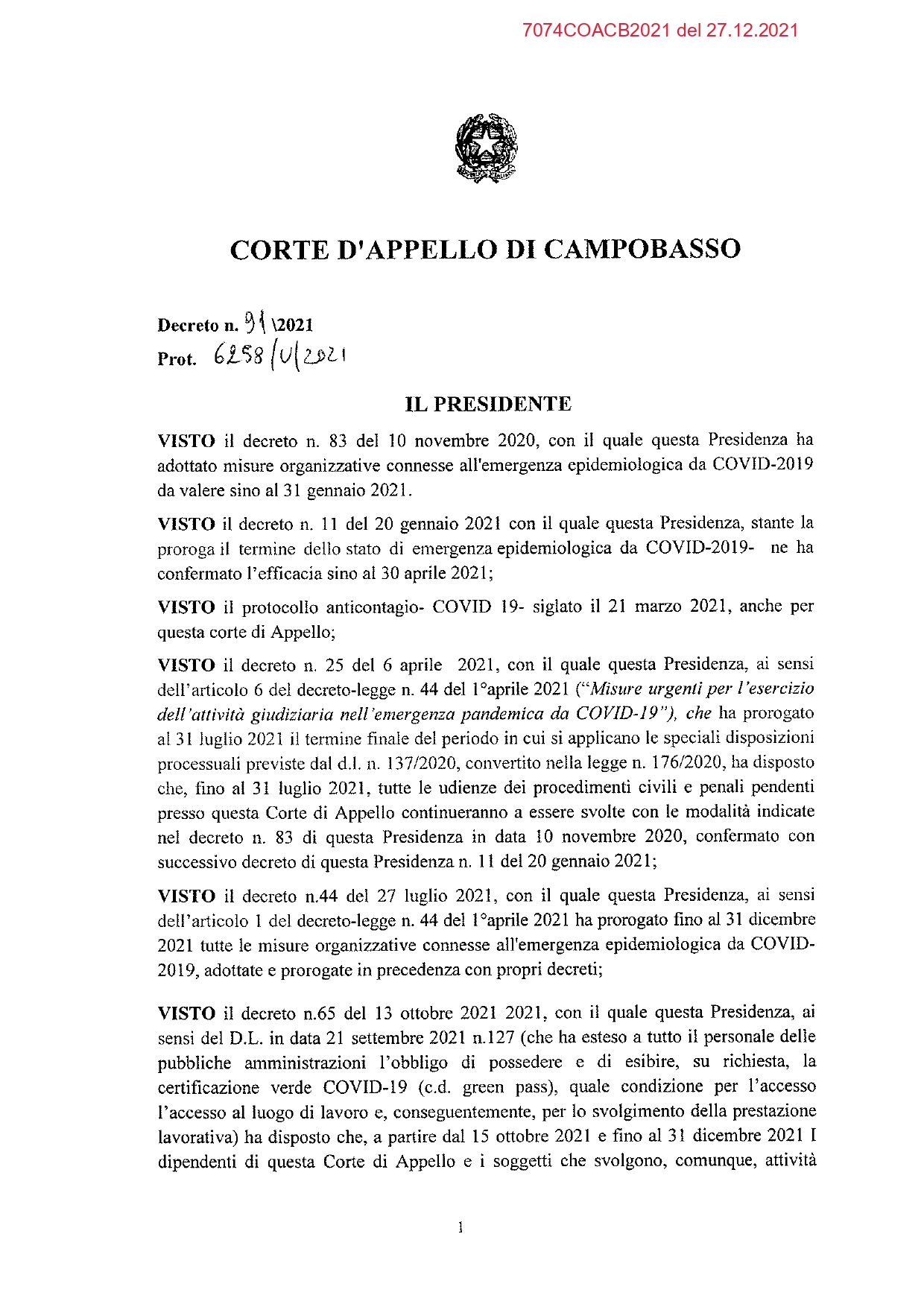 CORTE DI APPELLO – PROROGA AL 31 MARZO 2022 MISURE ORGANIZZATIVE EMERGENZA COVID-19