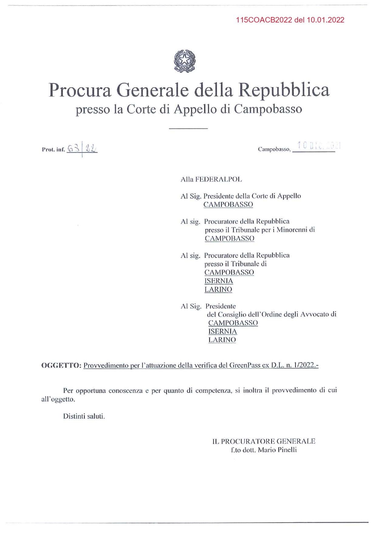 PROVVEDIMENTO PROCURATORE GENERALE – GREEN PASS