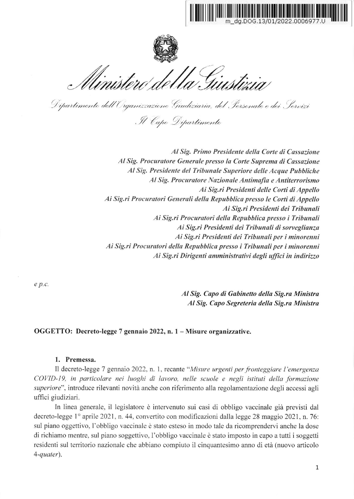 Ministero della Giustizia – Decreto Legge 7 gennaio 2022 n. 1 – Misure organizzative