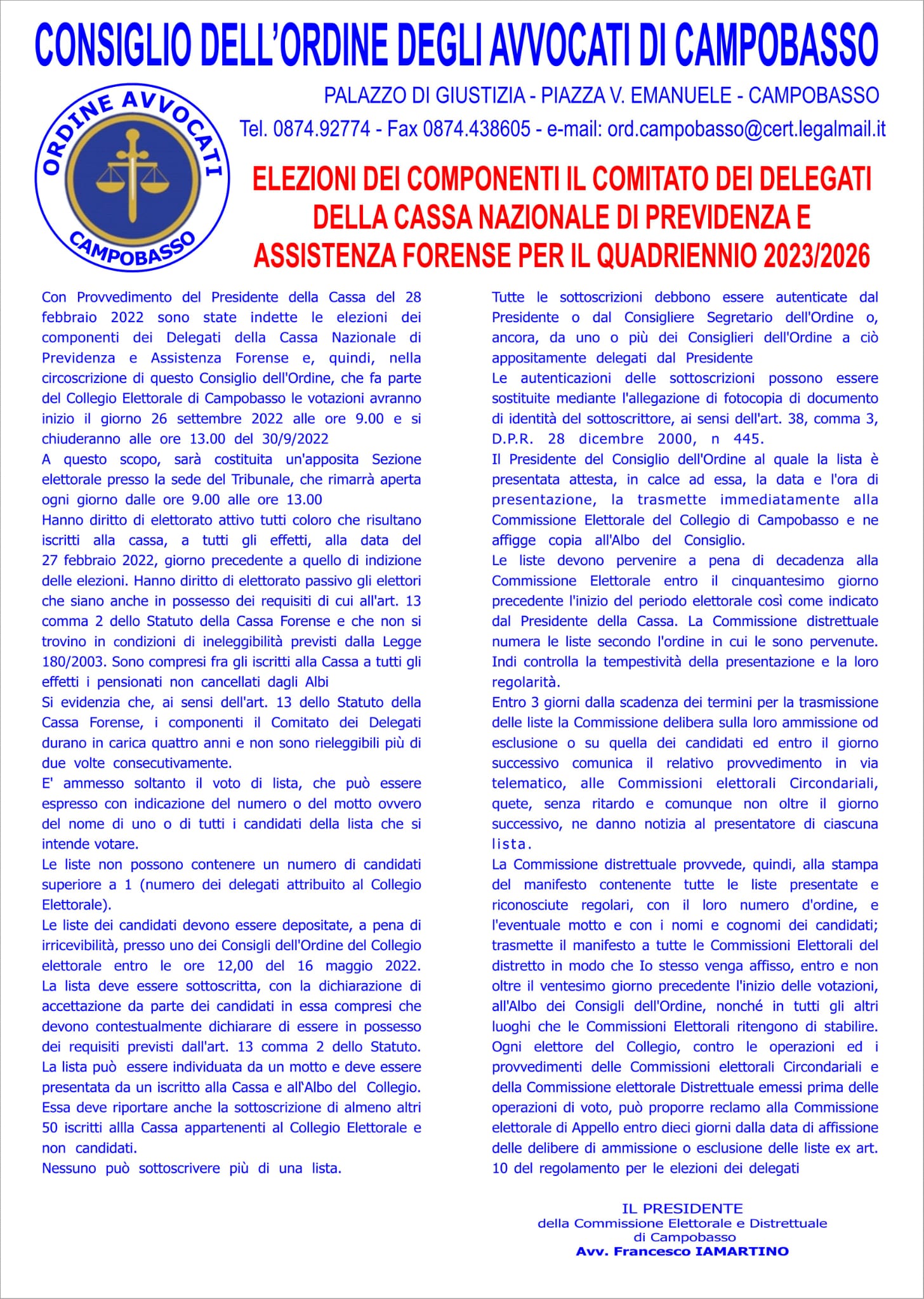 Elezione dei componenti il Comitato dei delegati della Cassa Nazionale di Previdenza e Assistenza Forense per il quadriennio 2023/2026
