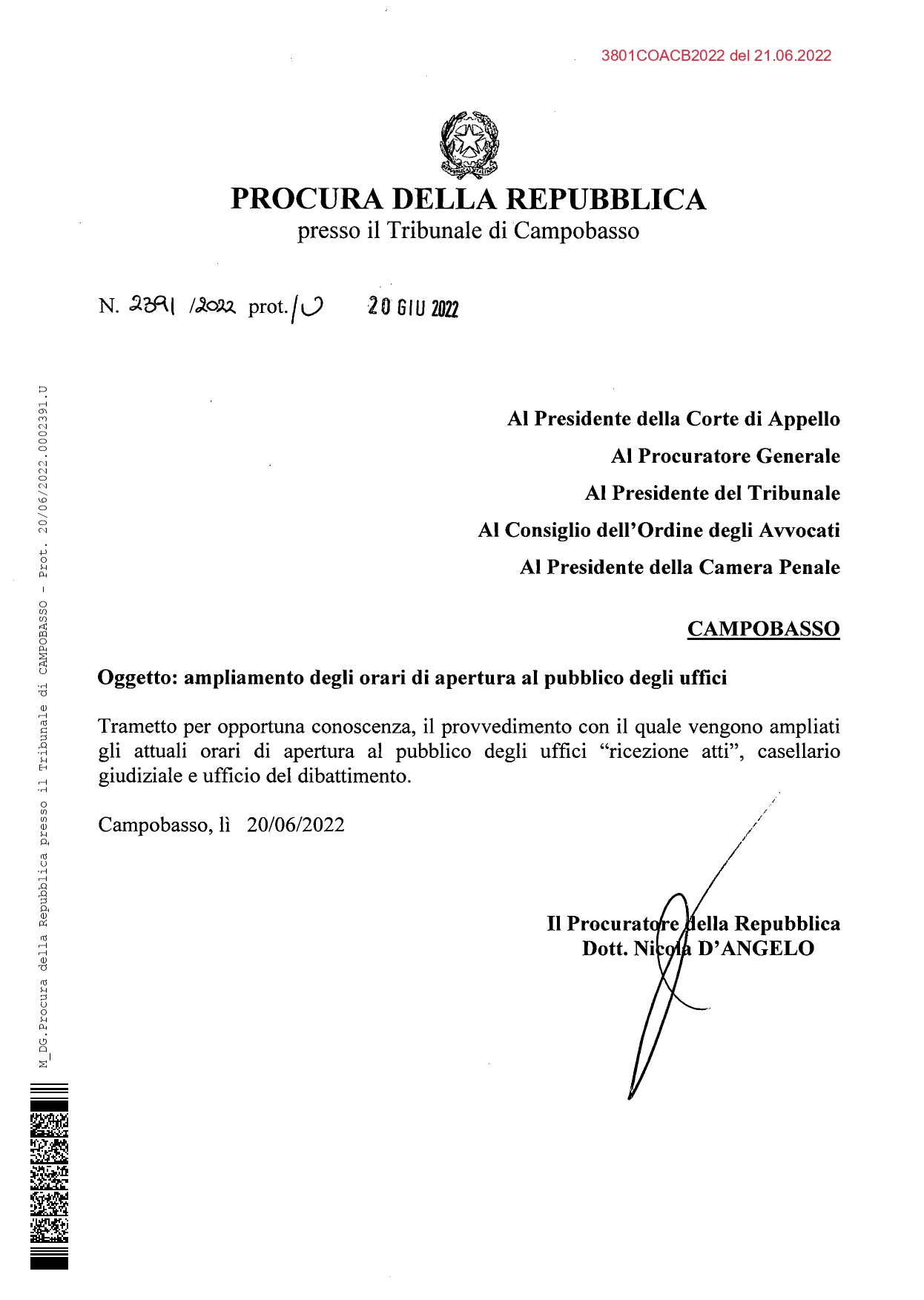 3801COACB2022-ampliamento degli orari di apertura al pubblico degli uffici - invio documentazione registrata come Prot.