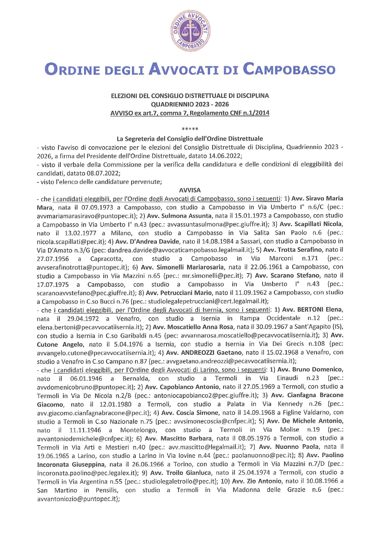 Elezioni Del Consiglio Distrettuale Di Disciplina Quadriennio 2023 – 2026 – Avviso Ex Art.7, Comma 7, Regolamento Cnf N.1/2014