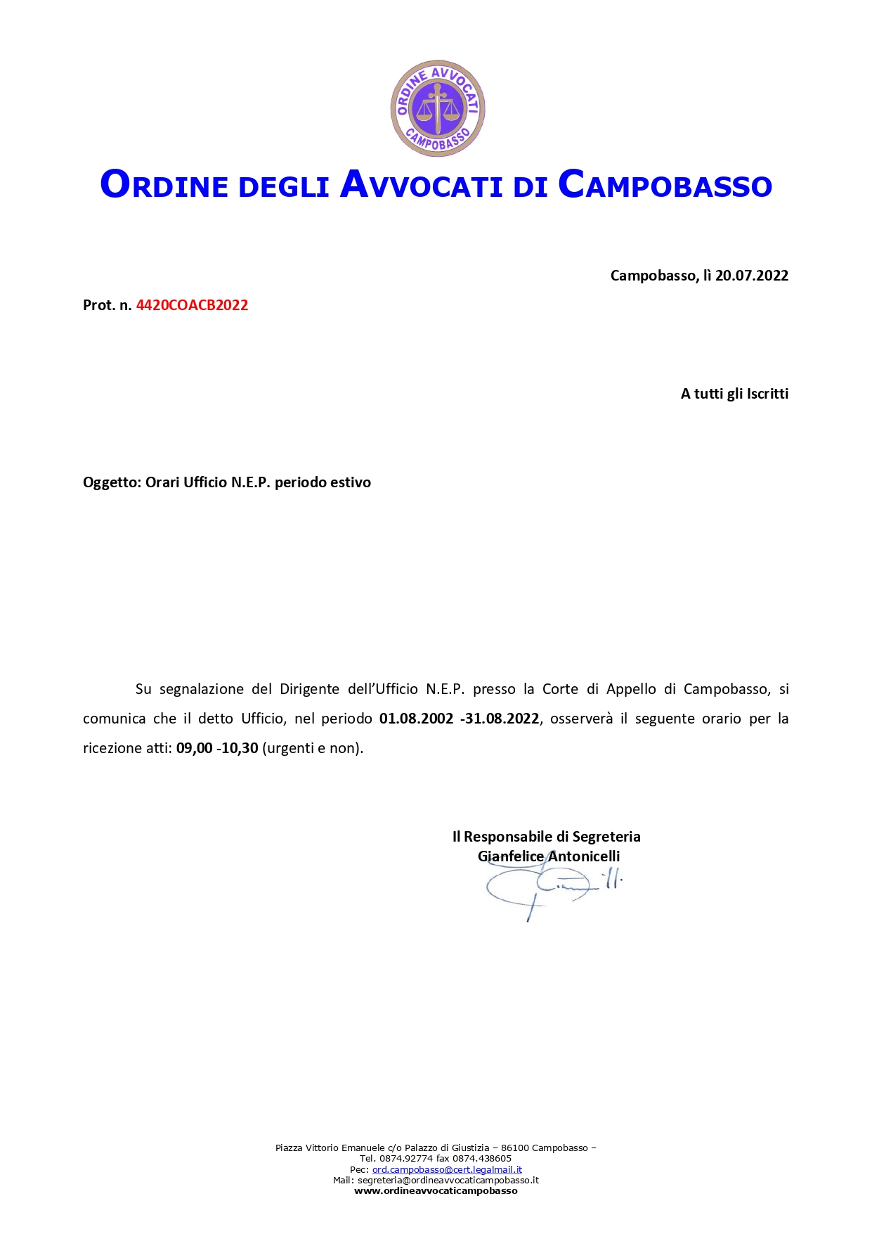Comunicazione orari Ufficio N.E.P. periodo estivo