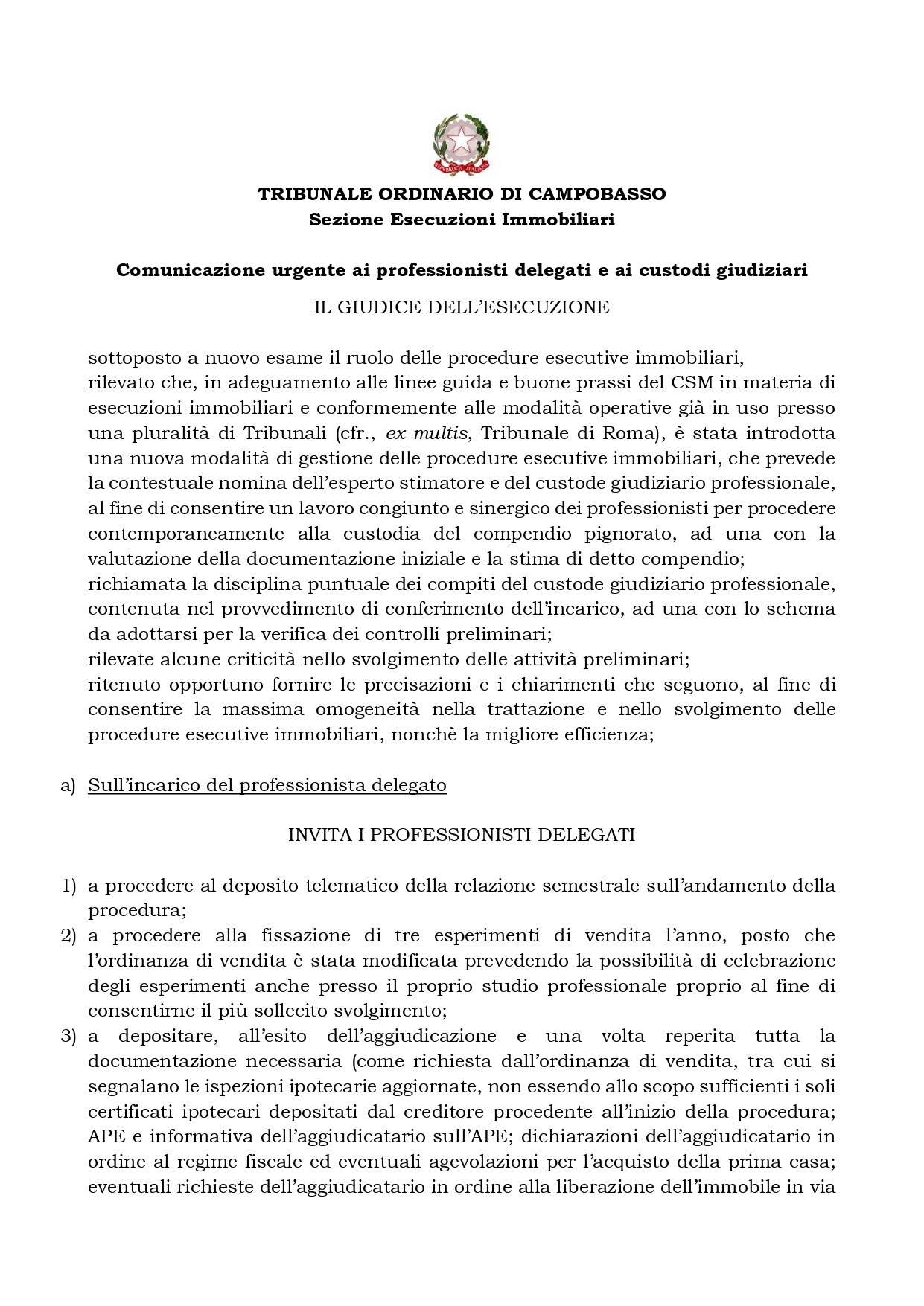 Tribunale di Campobasso – Dr.ssa Carissimi – Comunicazione urgente ai professionisti delegati e ai custodi giudiziari