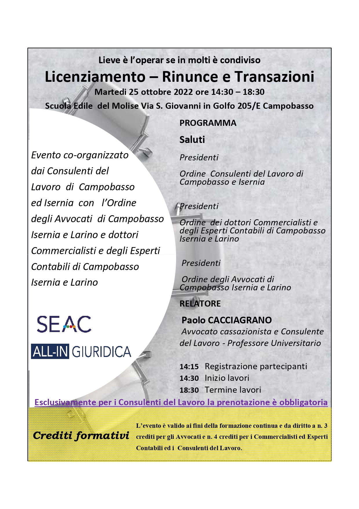 Licenziamento – Rinunce e Transazioni – Martedi 25 ottobre 2022 ore 14:30 – 18:30 – 3 C.F.