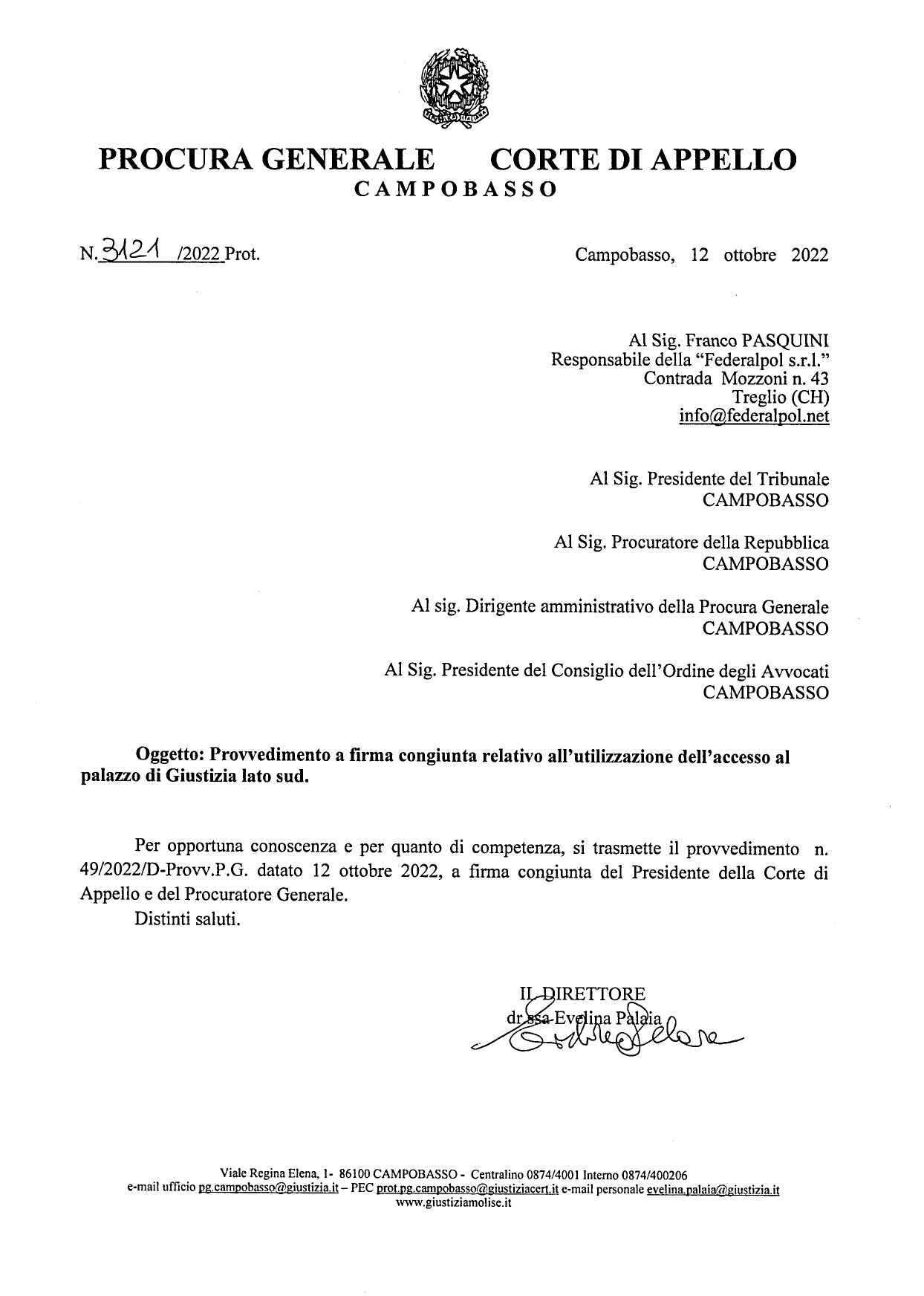 Procura Generale Corte Appello Campobasso – Provvedimento a firma congiunta relativo all’utilizzazione dell’accesso al Palazzo di Giustizia lato sud