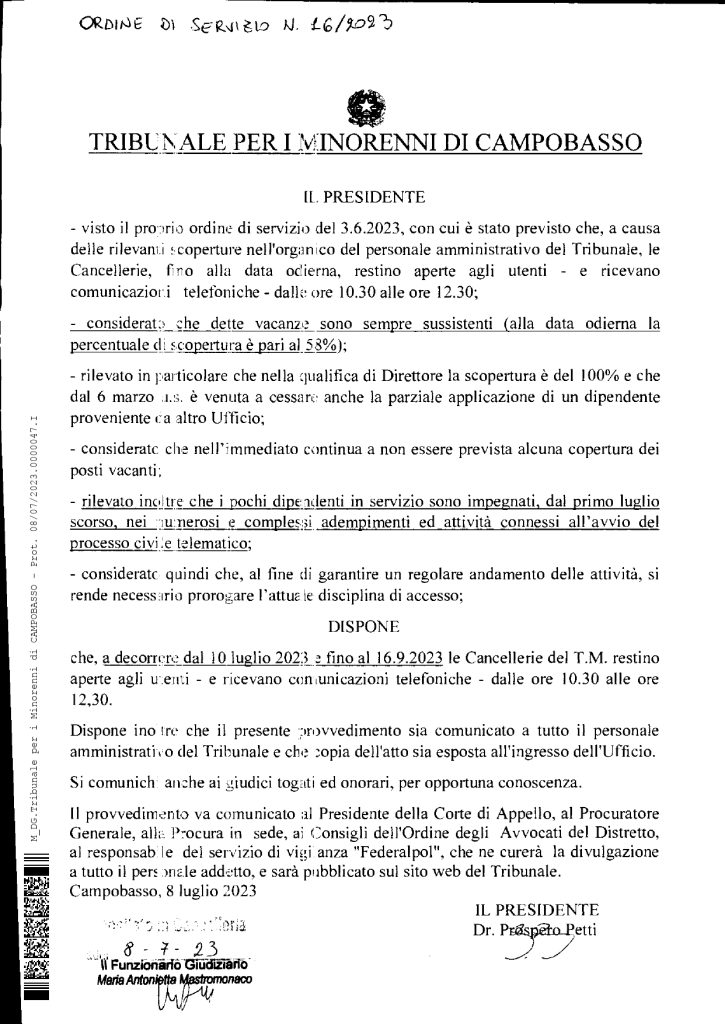 TRIB. MINORENNI _ Orario cancellerie 10.07 – 16.09.2023