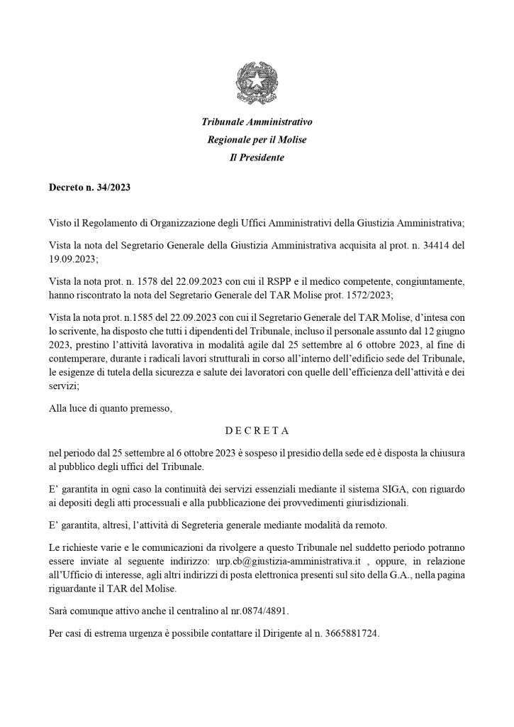 TAR Molise – chiusura uffici 25.09. – 06.10.2023